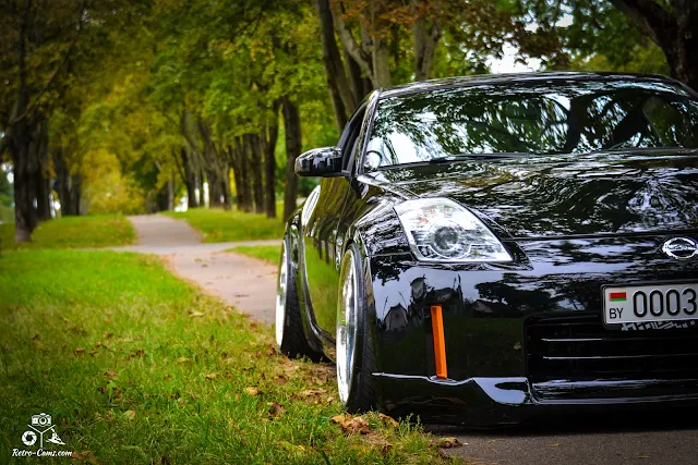И вот на выбранную заранее аллею поворачивает красавец-ниссан. Первая мысль: какой же он красивый, но такой низкий... Как же он ездит??? По словам Виталика, владельца 350z, настоящего JDM'щика и просто хорошего парня, ездит по нашим дорогам хорошо, но на неровных участках приходится сбрасывать скорость и аккуратно объезжать неровности. Автомобиль находится в идеальном состоянии. Давно не видел настолько ухоженных авто. Но это не коллекционный экспонат. Уже через несколько дней Виталик будет жечь покрышки на дрифт-полигоне. Так что не пропустите следующий фотоотчёт.